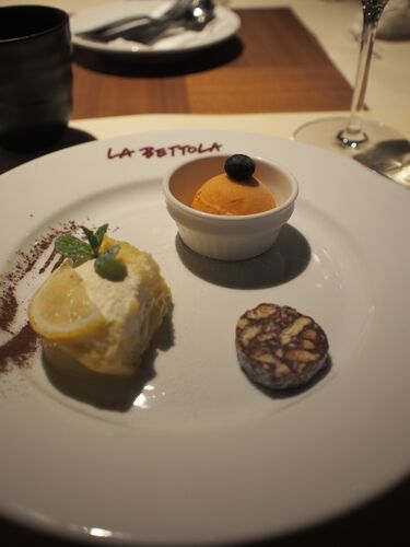 金沢 曇り、名古屋で商談があり、おそくなりました。イタリア料理レストラン、ラ・ベットラ・ダ・オチアイ「カナザワ」で、忘年会でした。最後の「デザート」も、たいへん美味しく頂きました(笑)【撮影場所 金沢市香林坊:2018年12月14日 OLYMPUS E-PL6】…