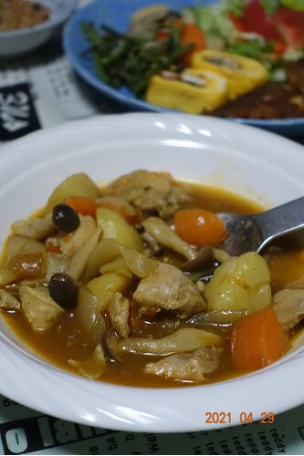 金沢 曇り、猫の目のようにくるくる変わる天気で、今は曇ってますが、予報では雨です。以前にもUPしているグリコ「バランス食堂の鶏のカレー炒め」が好きです。の素を使った一品で、最後は白ご飯を投入して、美味しく頂きました(笑)【撮影場所 自宅:202…