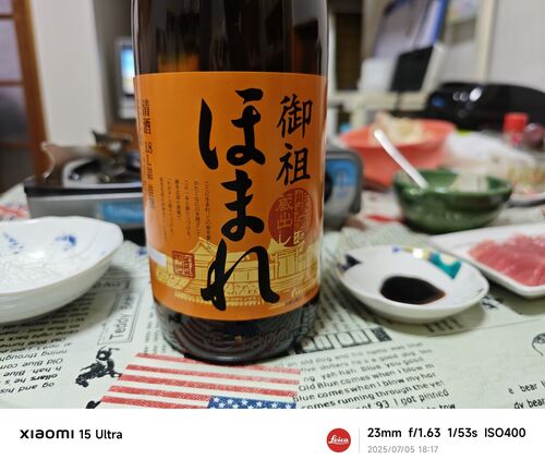金沢 晴れ、今日も30℃を超え、暑い一日でした。 この日は、スーパーで「まぐろ解体ショー」をやっていました。刺身用柵を購入しこれを肴に、にビールから冷やした日本酒、最後は焼酎のフルコースでした(笑) 御祖酒造(みおやしゅぞう)の「ほまれ」佳撰は…