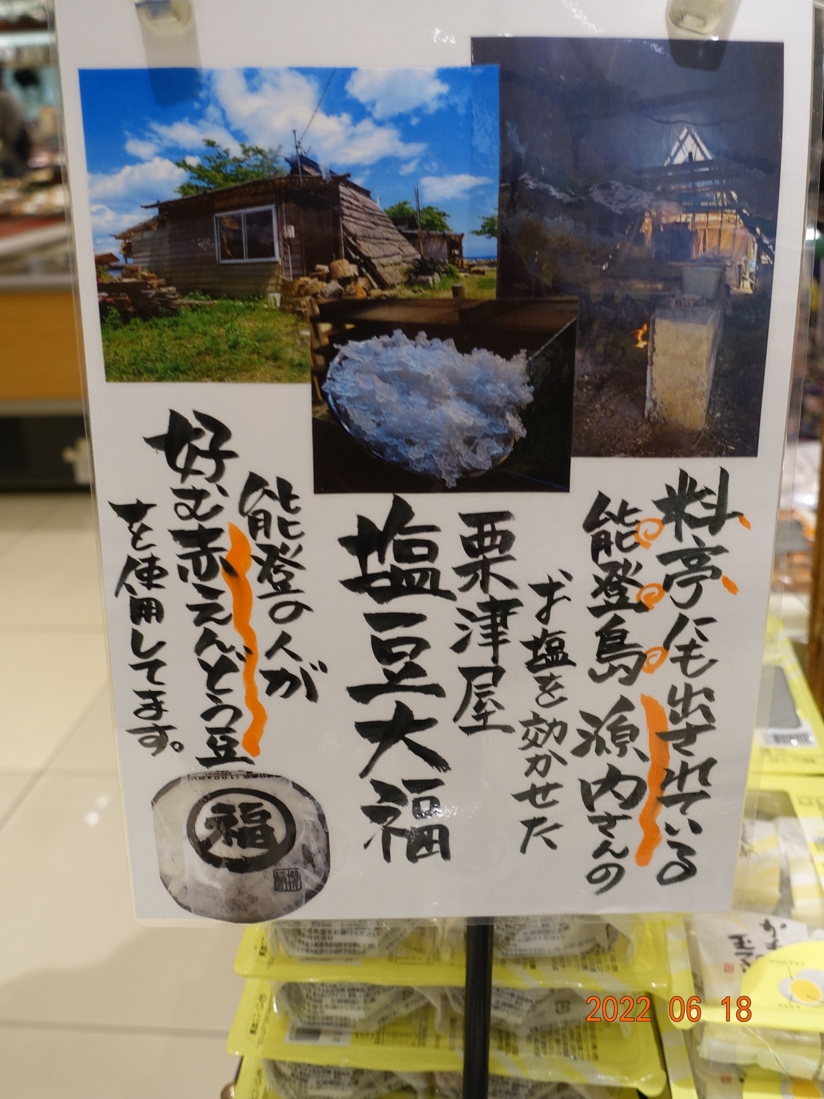 2022-06-21 粟津屋「塩豆大福」 金沢 曇り、今日はいくぶんすずしかったですが、雨降りません。どんたく西南部店で見つけた、美味しそうな粟津屋「塩豆大福」を購入し、期待通り美味しく頂きました(笑)【撮影場所 自宅:2022年06月18日 DSC-RX100M3】【撮影場所 金沢市どんたく西南部店:2022年06月18日 DSC-RX100M3】 ランキング参加中でもう一押しお願いします