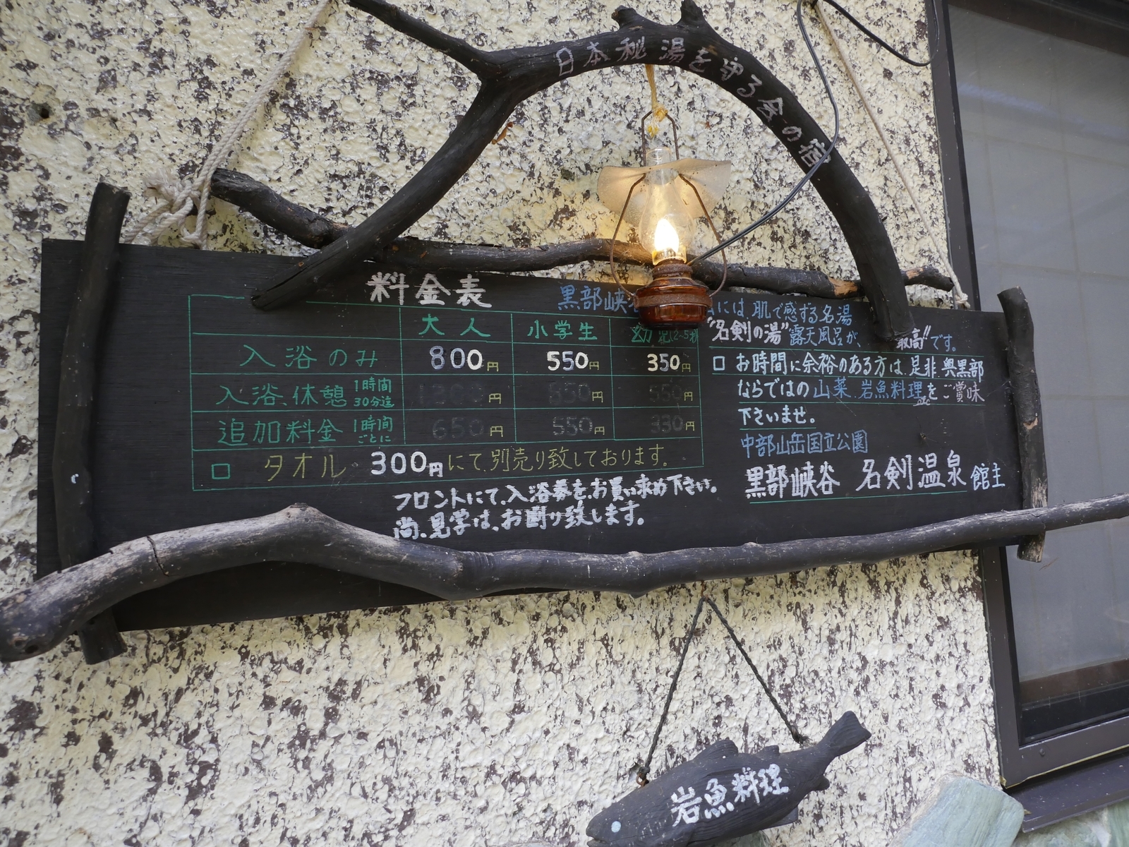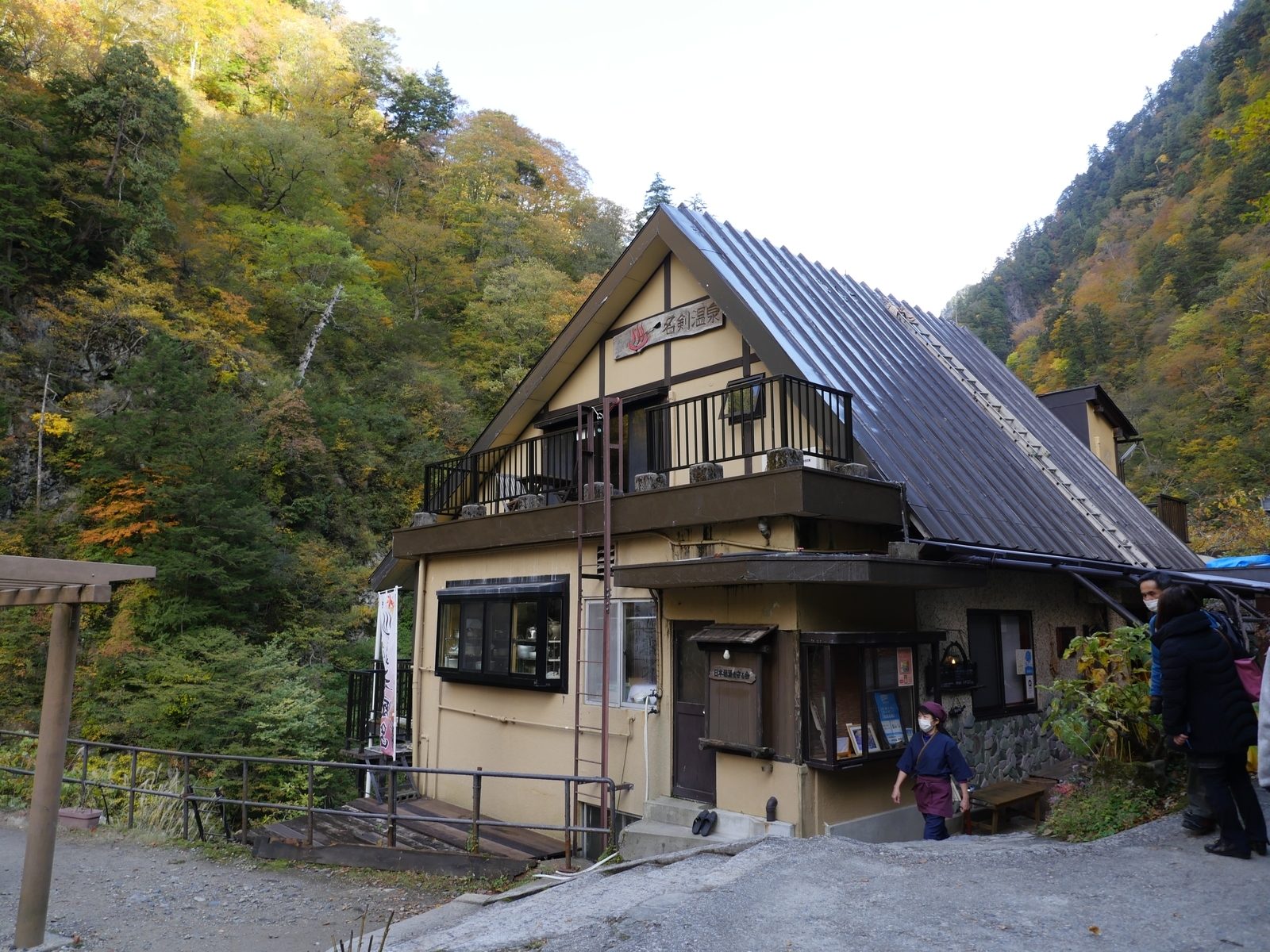 【ウィキペディア引用】名剣温泉(めいけんおんせん)は、富山県黒部市(旧・越中国)にある温泉。欅平駅よりの山道の先に、日本秘湯を守る会にも属する1軒宿「名剣温泉旅館」が存在する(地上2階、地下2階建ての山小屋風の建物)。男女別の内湯、まわりの木々や大きな自然石をそのまま生かした渓谷を見下ろす露天風呂(いずれも女湯のほうが大きめ)、それに貸し切り湯がある。午後2時までなら日帰り入浴も可能である。