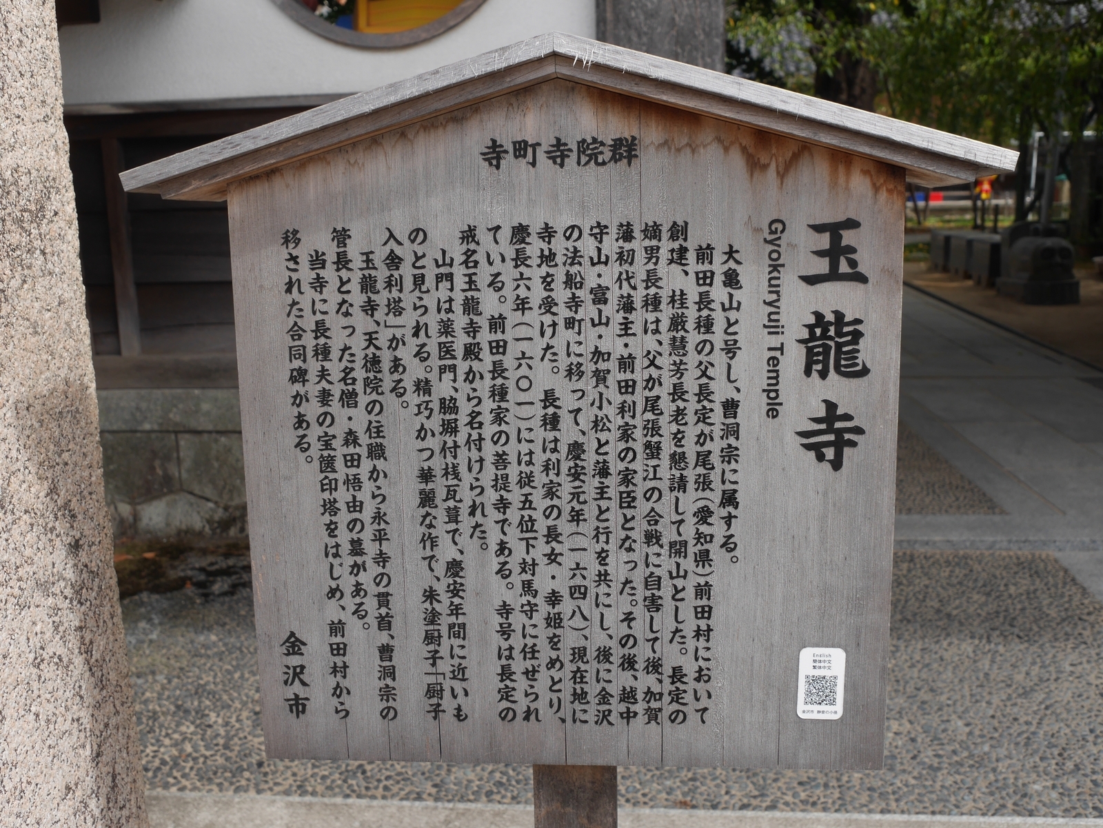 【ウィキペディア引用】寺町寺院群(てらまちじいんぐん)は、石川県金沢市寺町・野町にある寺院の総称である。藩政期に一向一揆に対する防衛策として、犀川流域にあたるこの地に寺院が集められた。同様にして、金沢城の東側の卯辰山には卯辰山山麓寺院群、南東の小立野台地には小立野寺院群が形成された。忍者寺として知られる妙立寺を始め、70近くの寺院が立ち並び、市内の三つの寺院群の中で最大規模である。
