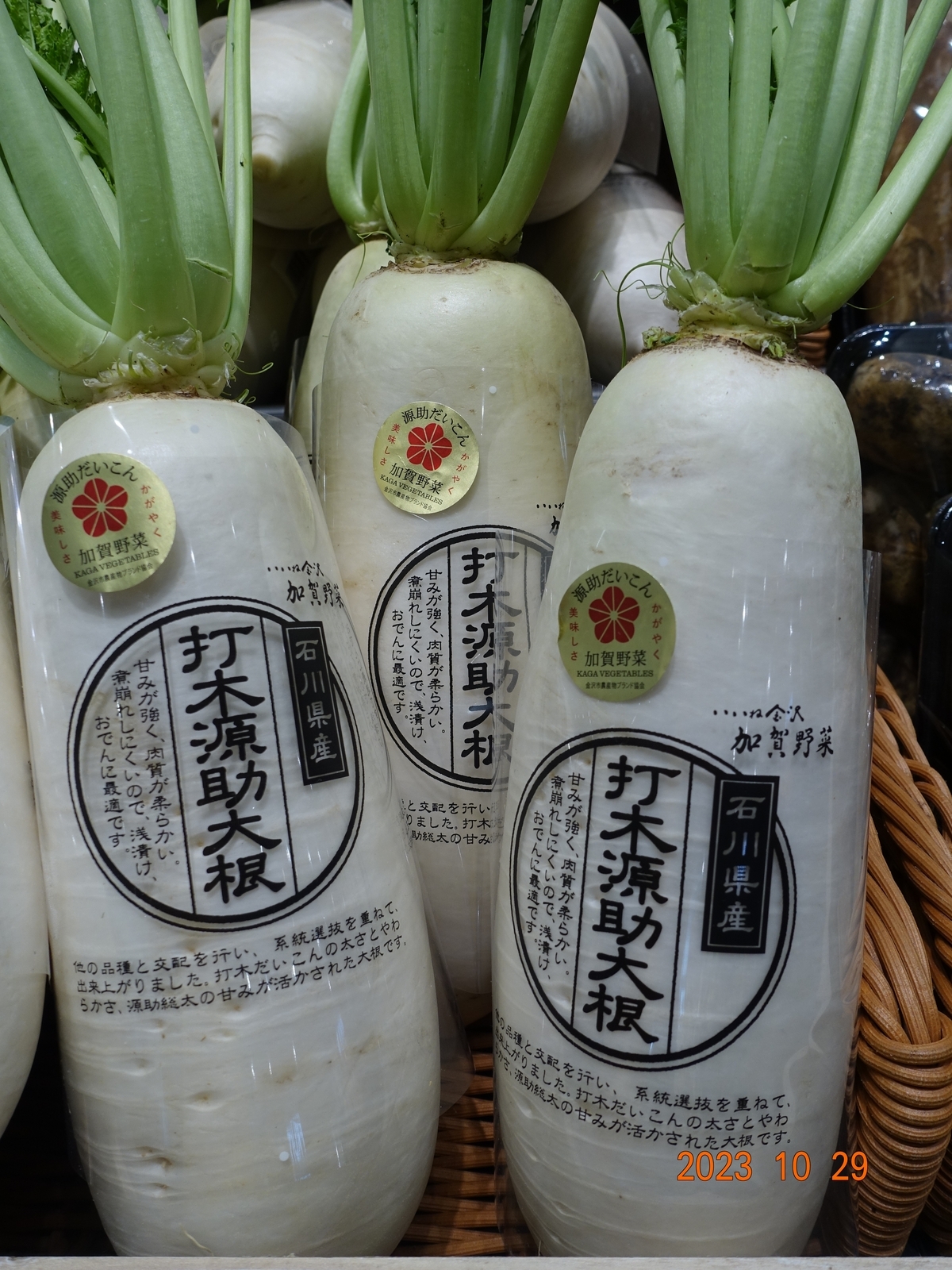 2023-11-06 加賀野菜「打木源助大根」 ✨ 金沢ディスカバリー これからの季節外せない野菜です(笑)【撮影場所 イオンモール白山:2023年10月29日 DSC-RX100M3】【加賀野菜HP引用】源助だいこんは生育や収穫の途中で割れやすく、栽培が難しいのですが、生産者が1本1本丁寧に育て上げた上質な源助だいこんは、ころっとした見た目にぬくもりを感じる、寒い季節にぴったりの食材です。 近年「金沢おでん」が有名であり、その中に入っている源助だいこんは間違いなく絶品です。皆様も機会があれば召し上がってください。ランキング参加中でもう一押しお願いします