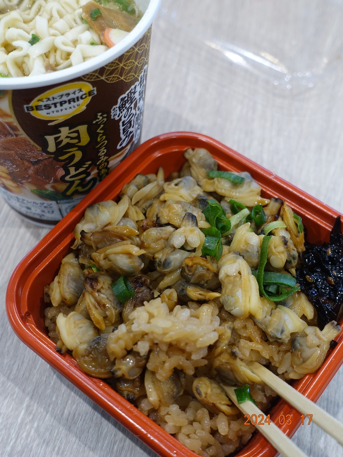 イオンのミニシリーズ「あさりの炊き込みご飯」+TOPVALUE肉うどんで、ご飯が少量が丁度いい量で美味しく頂きました(笑)