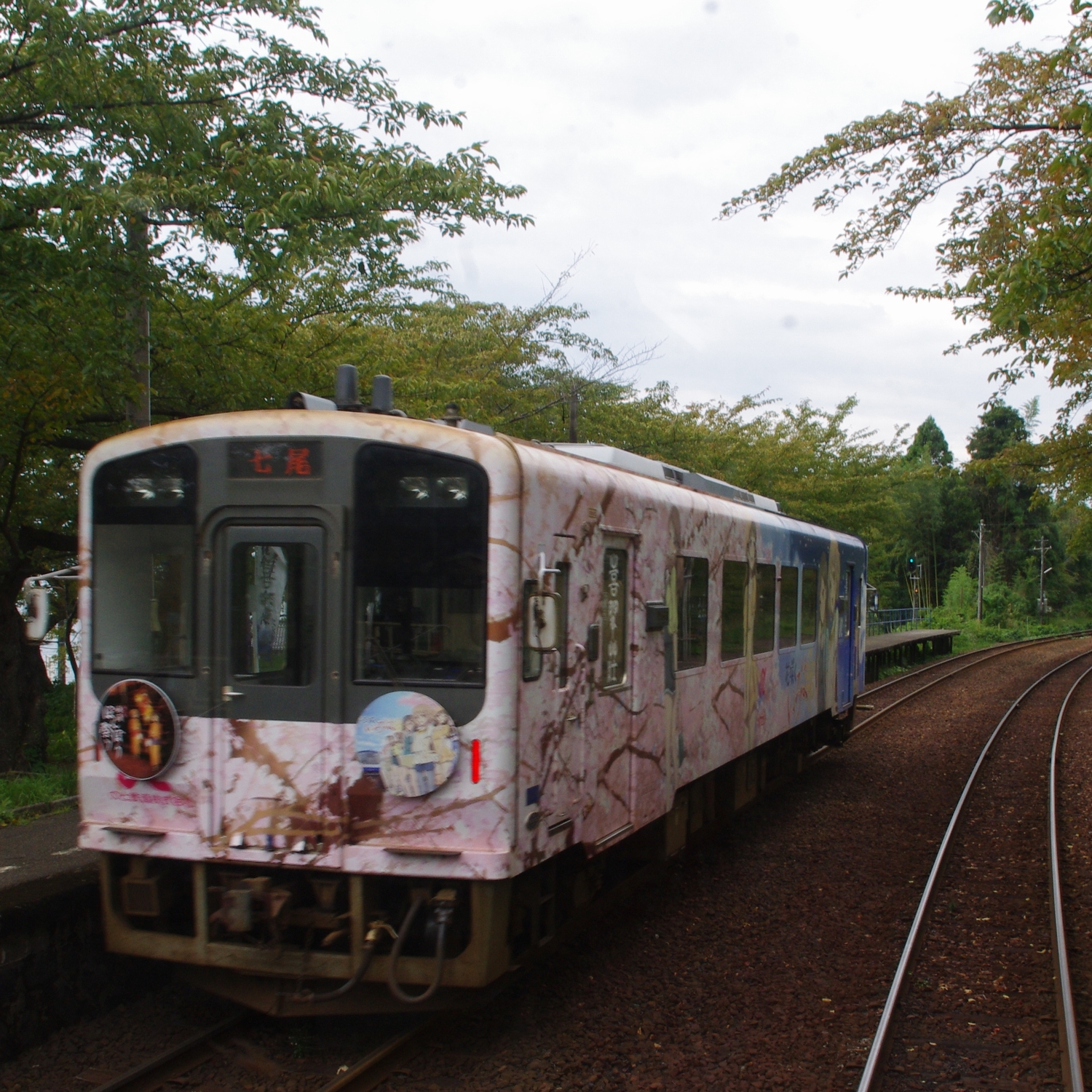 アニメ「花咲くいろは」のラッピング車両。車体には、湯涌温泉を舞台にした作品に登場するキャラクターや風景などが描かれていました。2024年7月現在も、NT204編成で運行されています。