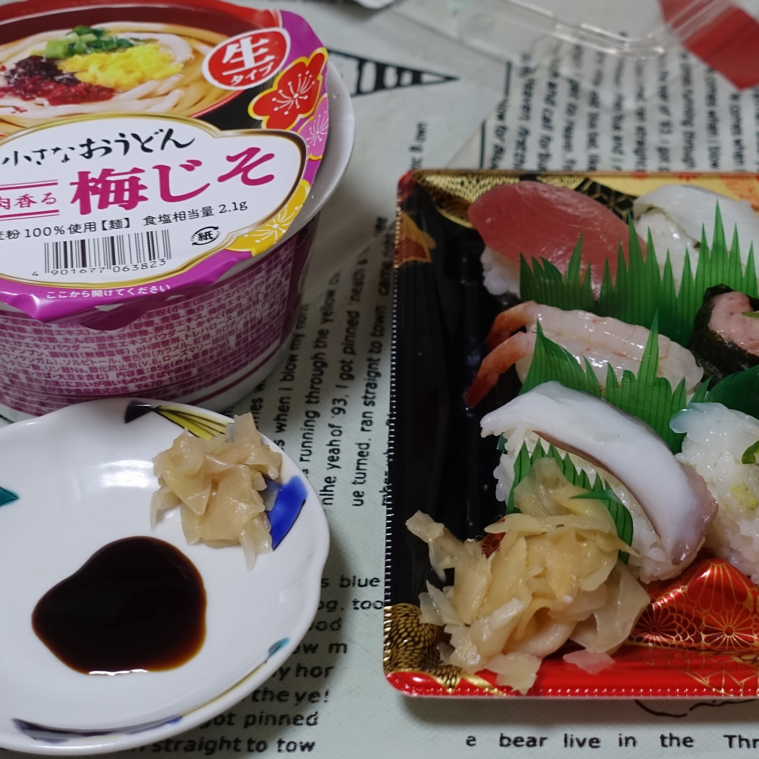 2024-12-15 火曜市限定にぎり寿司+小さなおうどん「梅じそ」 🏠 マイペースな日常 金沢 曇り、今は雨がやんでますが、一日中雨の予報です。 自宅から歩いて行ける「マックスバリュ増泉店」でお昼めしを調達しました。火曜市限定にぎり寿司に小さなおうどん「梅じそ」を追加して、おいしく頂きました(笑) 小さなおうどん「梅じそ」は、お湯を注ぐだけで手軽に楽しめる生タイプのミニカップうどんで、鰹の風味豊かなだしと、国産の赤しその風味が梅の酸味と絶妙にマッチし、さっぱりとした味わいです。 【撮影場所 自宅:2024年12月10日 DSC-RX100M3】