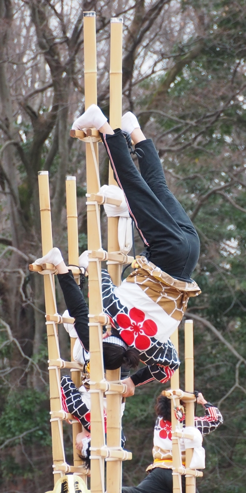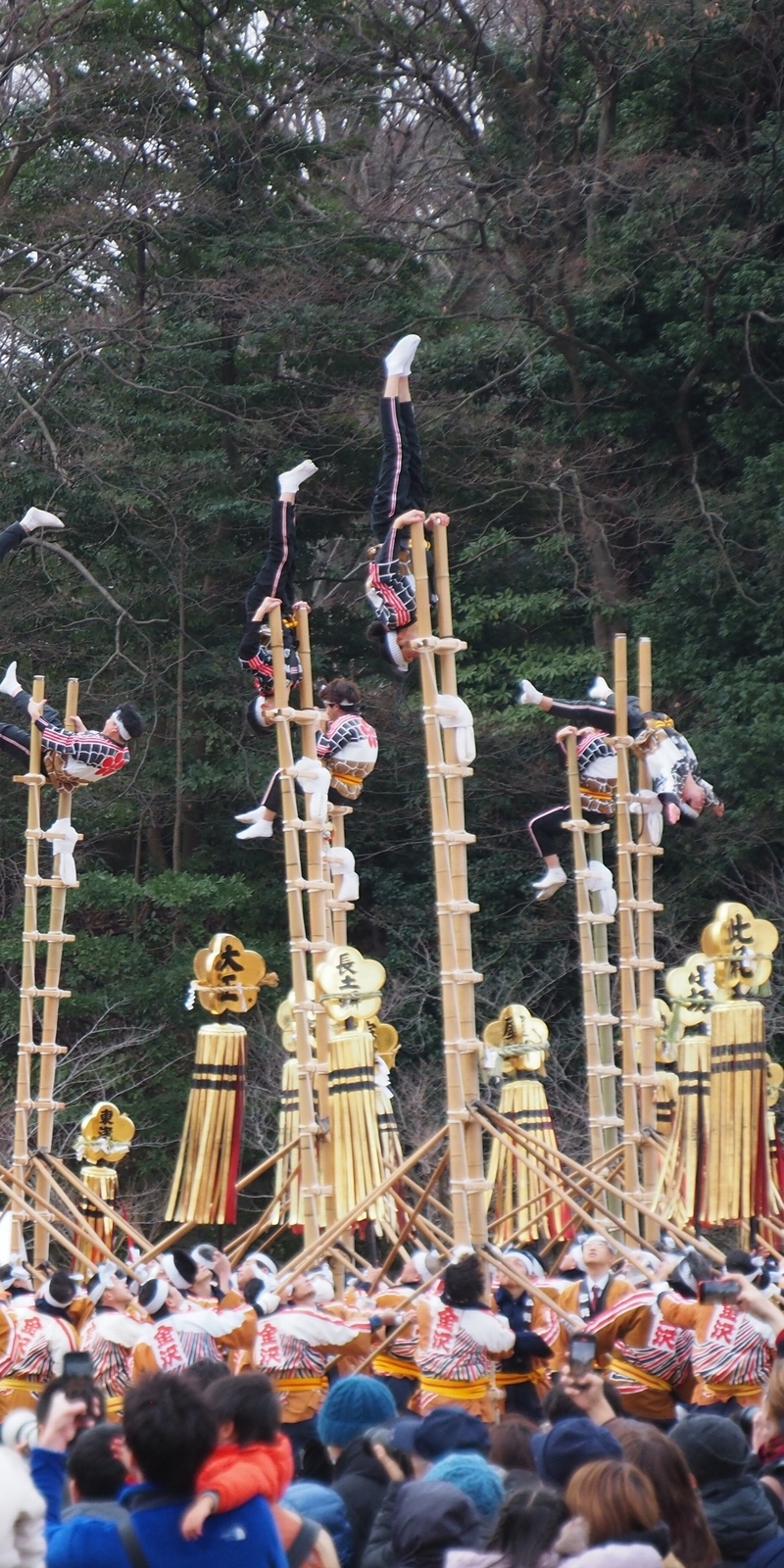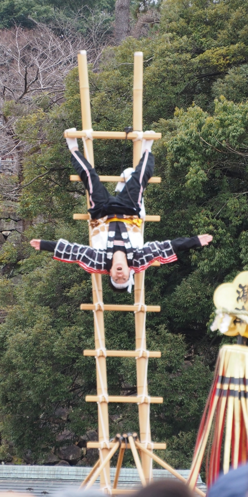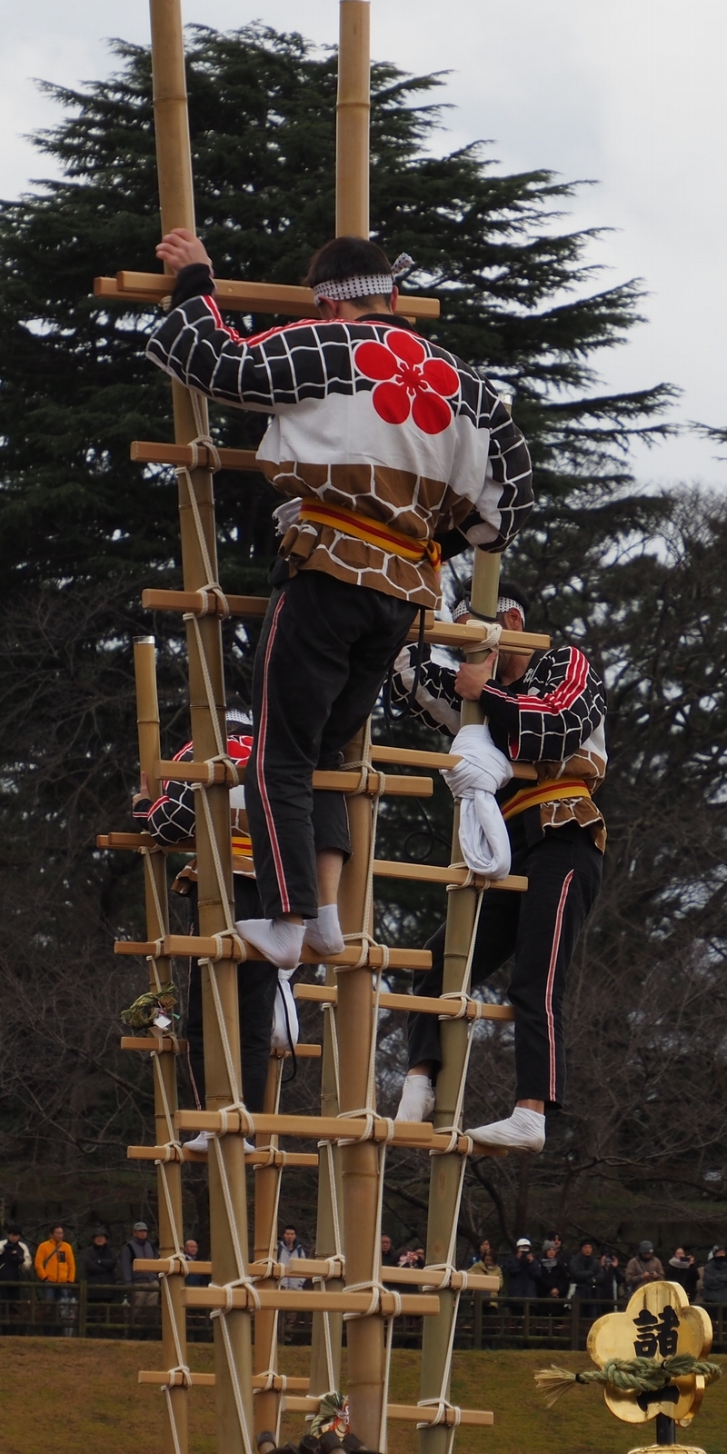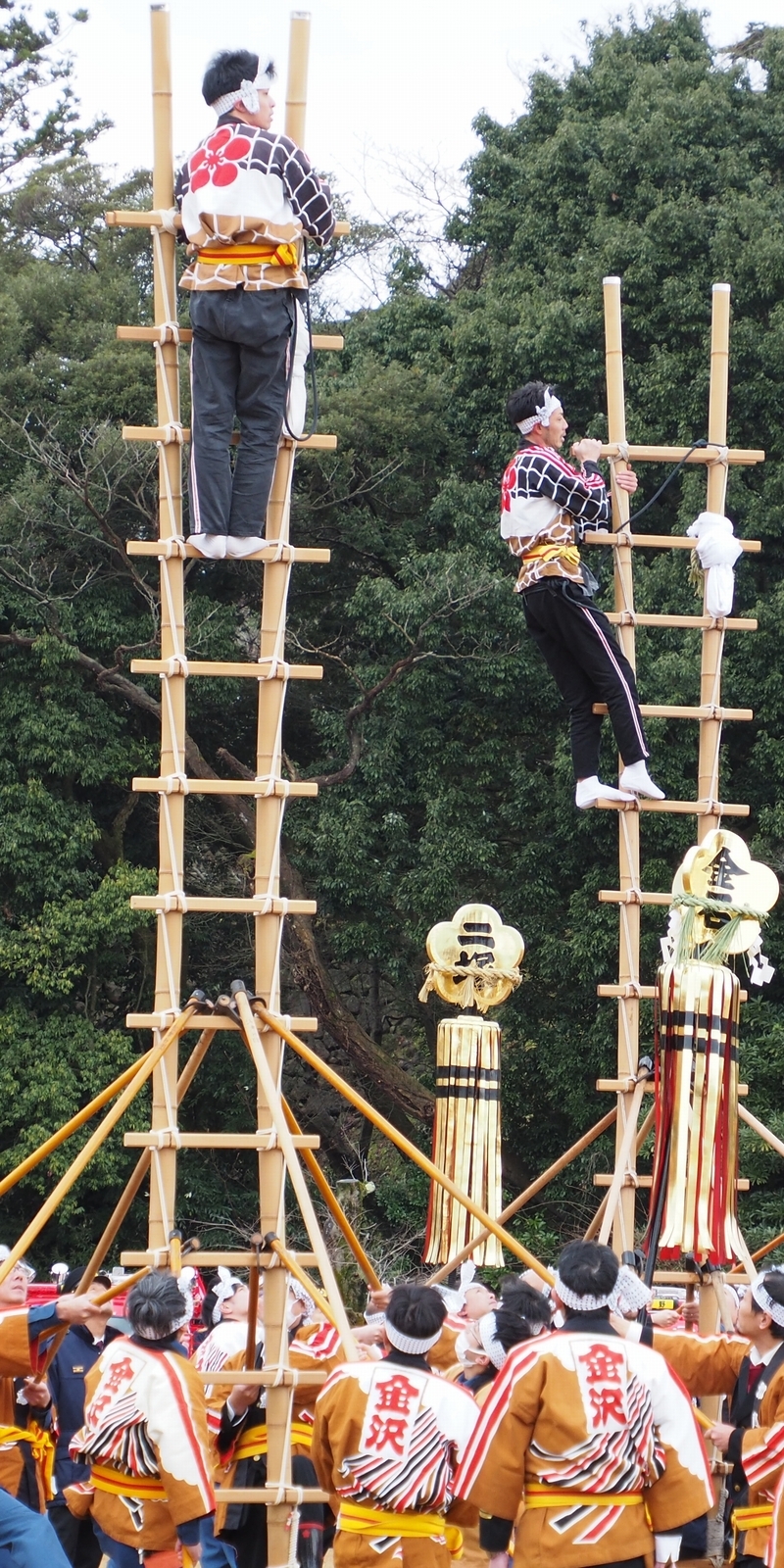 加賀梯子登りでは、38の消防分団それぞれが高さ約6メートルの竹のはしごを10人で支え、1人がよじ登って様々な技を観れました。