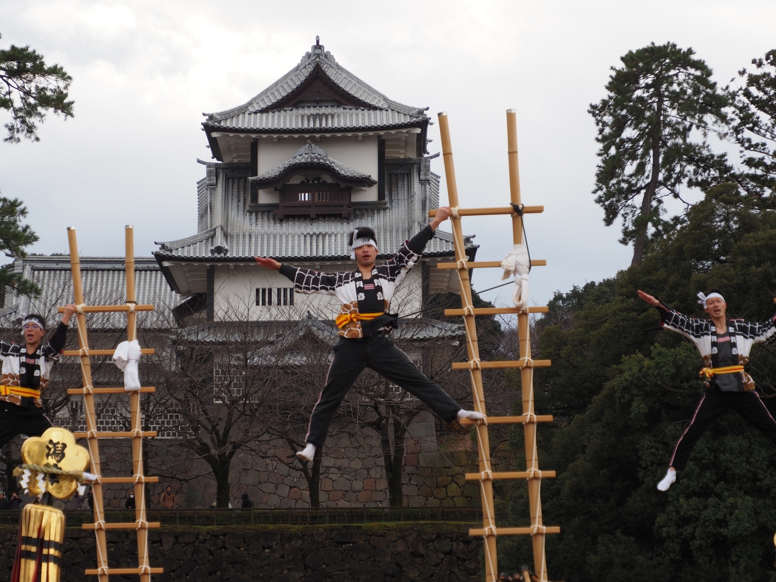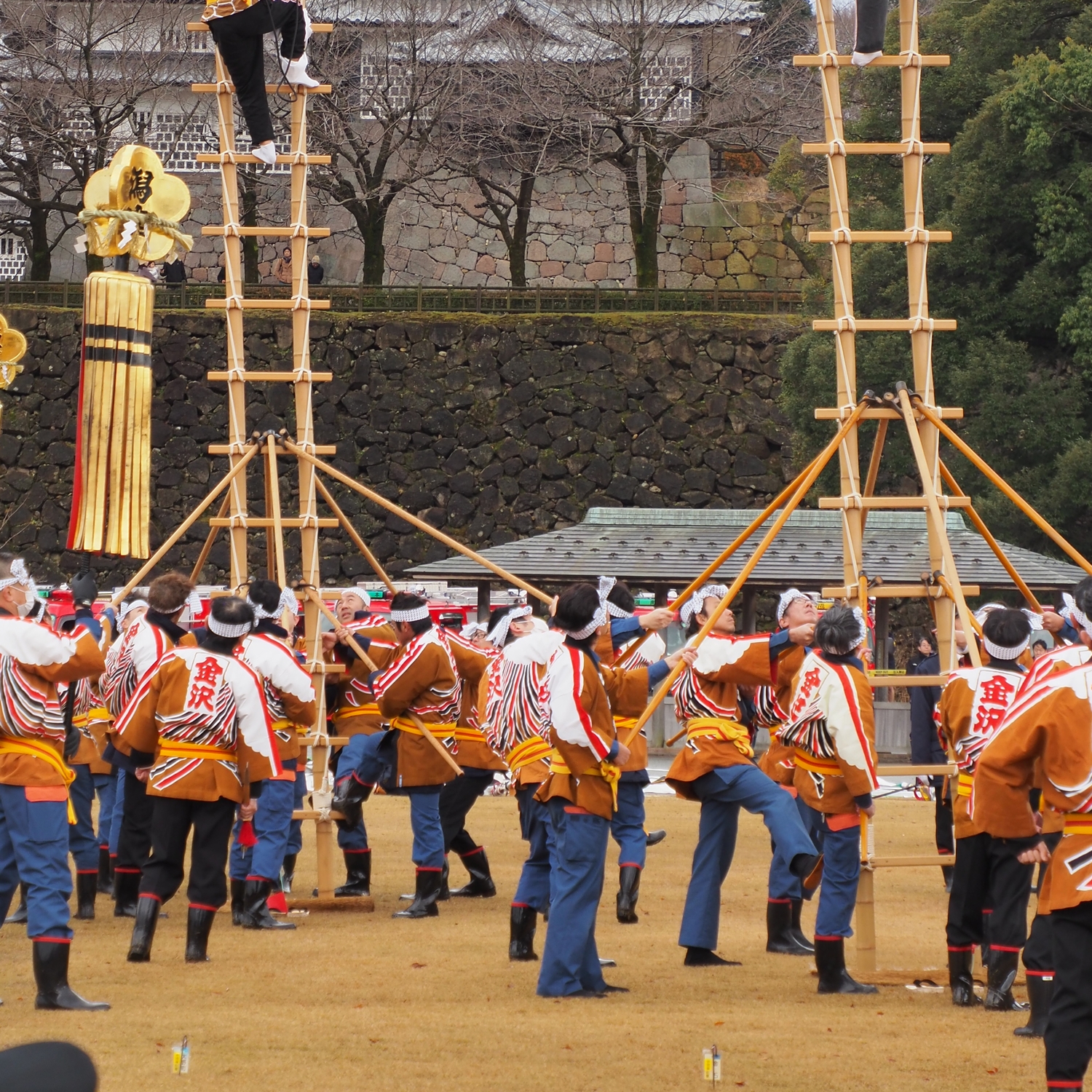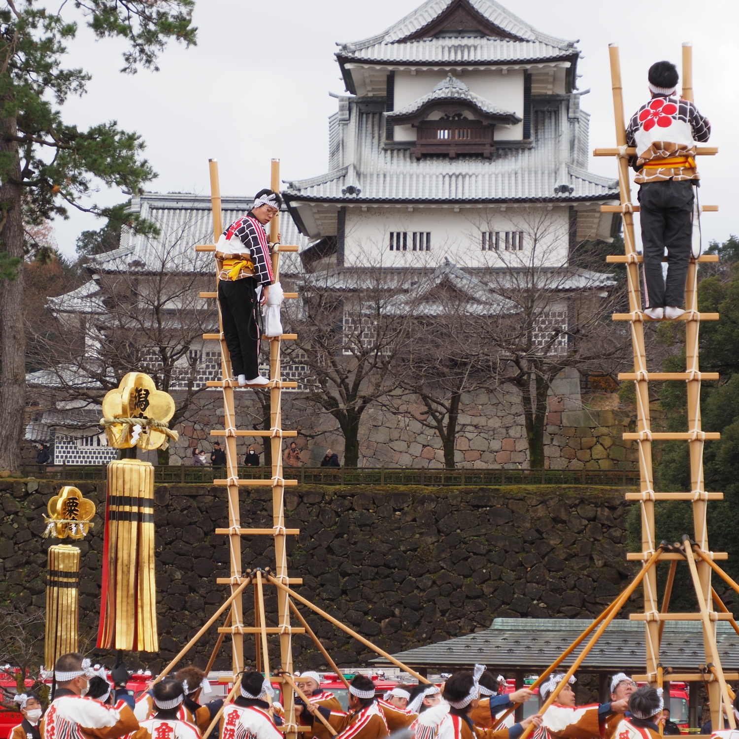 江戸時代、火災現場にはしごを立て、火事の状況を確かめたことが始で、金沢市を代表する伝統芸能の一つです。その華麗な技と勇猛な姿から多くの人々を魅了しています。