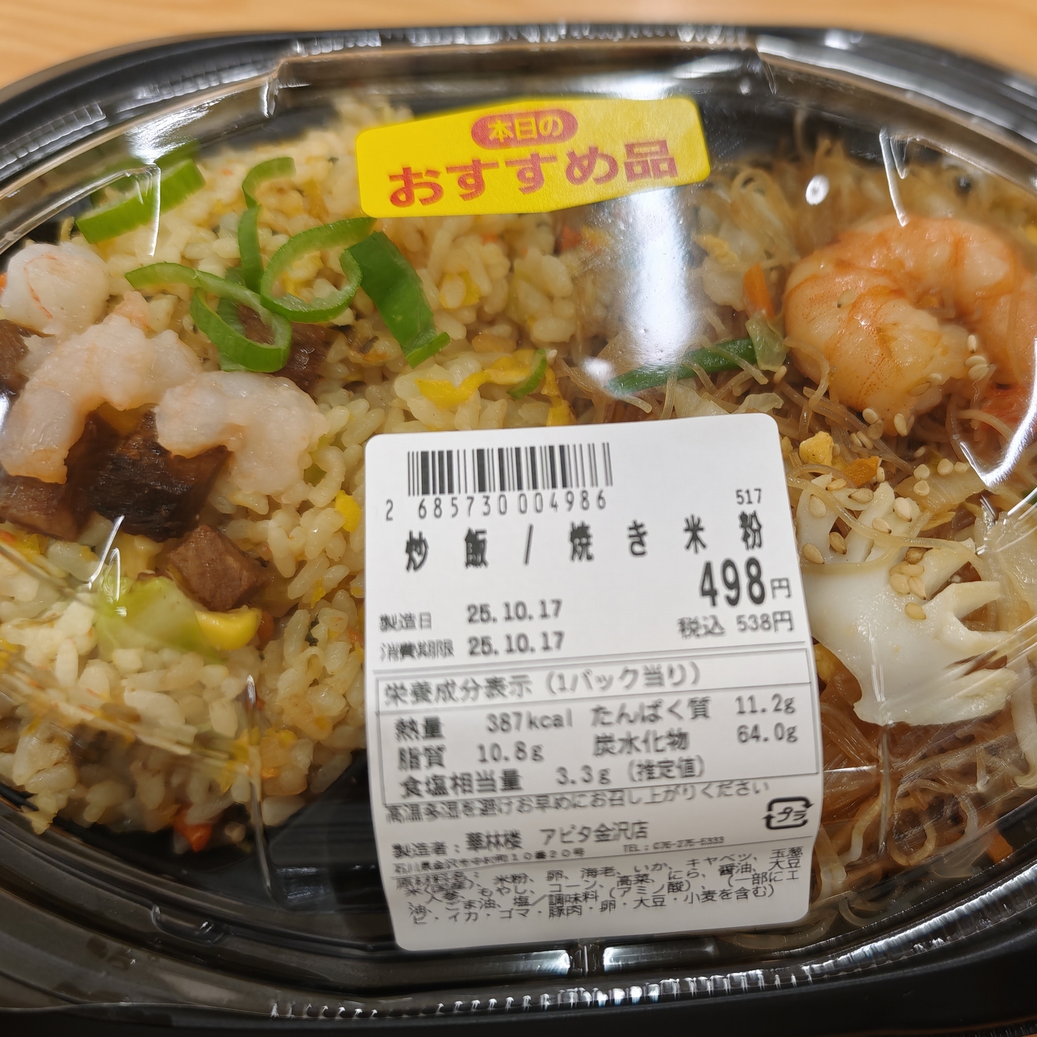 アピタ金沢で、「炒飯 / 焼き米粉」を食べました。ビーフンは、具たくさん、炒飯はパラパラで、おいしく頂きました(笑)