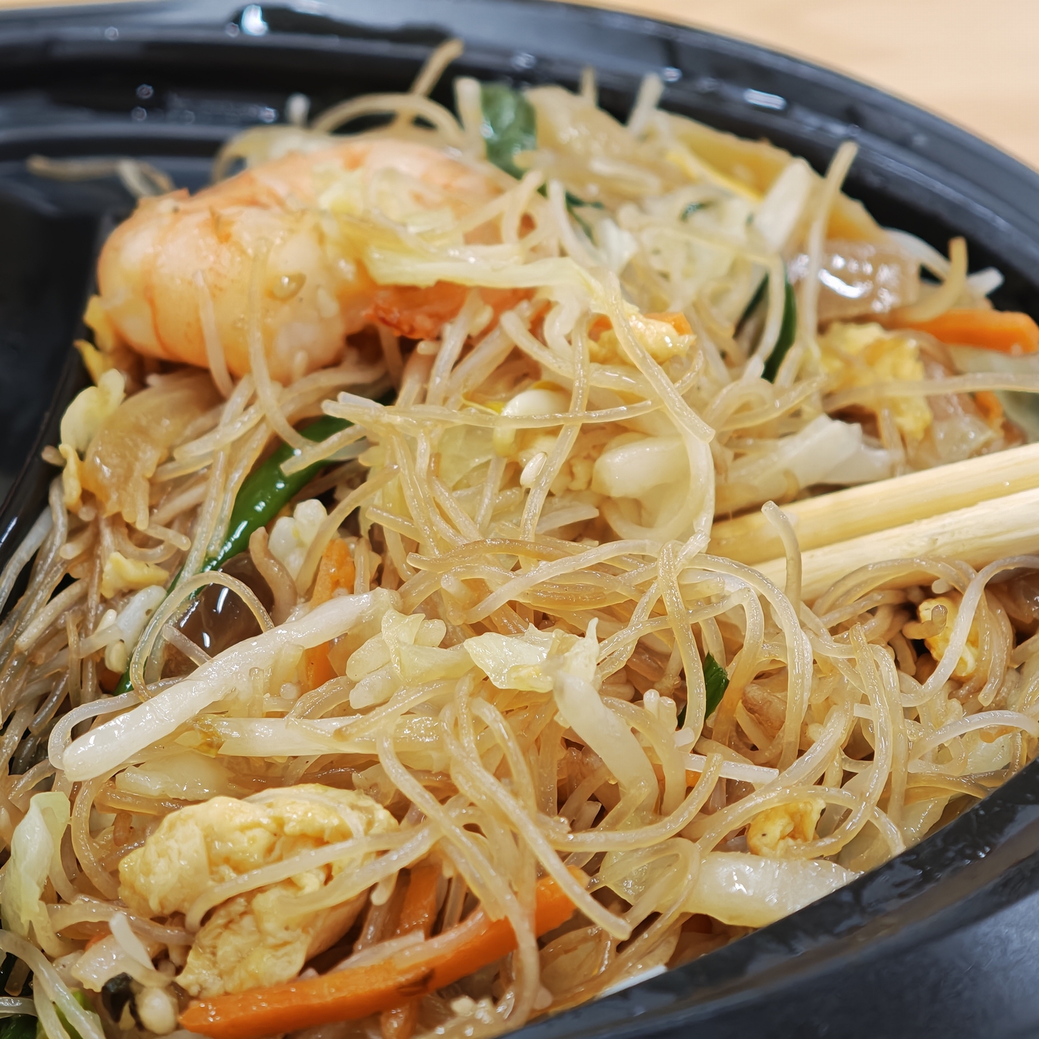 焼き米粉(やきビーフン、中国語では「炒米粉(チャオミーフェン)」とも呼ばれます)は、ビーフン(米粉)というお米を原料とする細い麺を、肉や野菜などの具材と一緒に炒めた料理です。具材としては、豚肉、エビ、キャベツ、ニンジン、タマネギ、キクラゲ、干しエビ、干ししいたけなどがよく使われます。