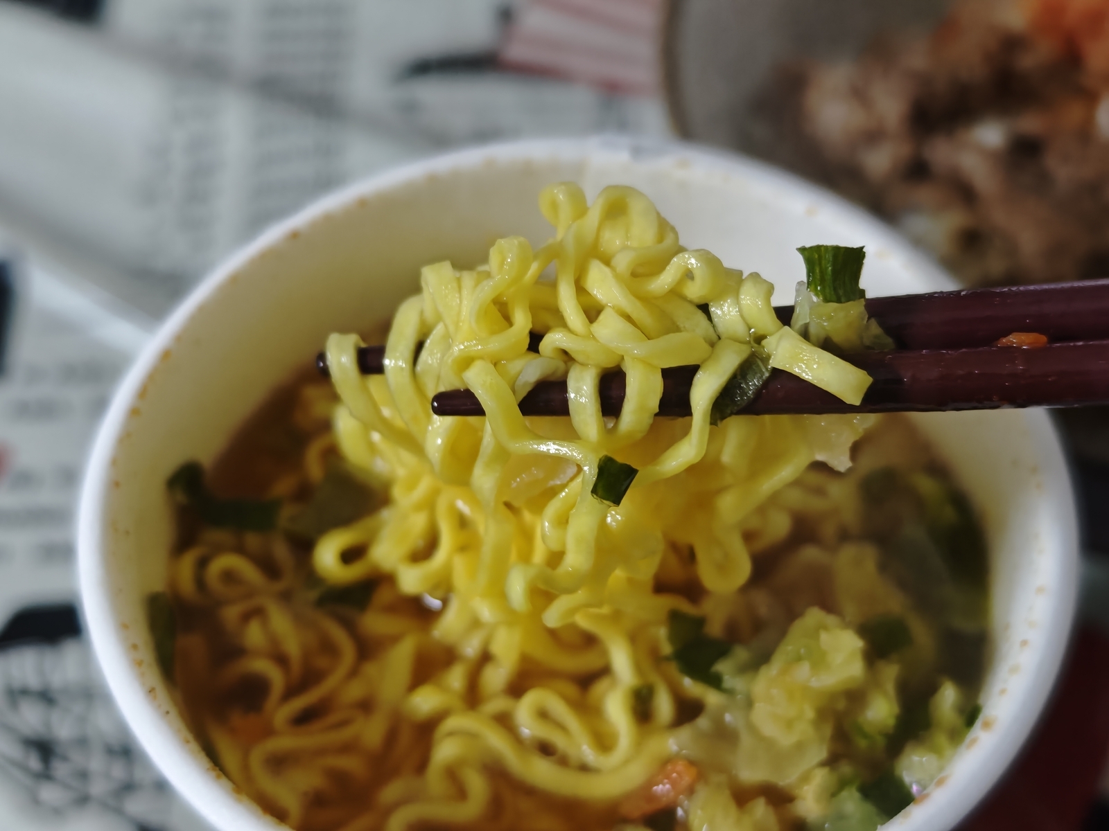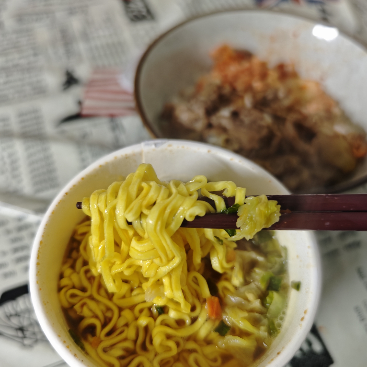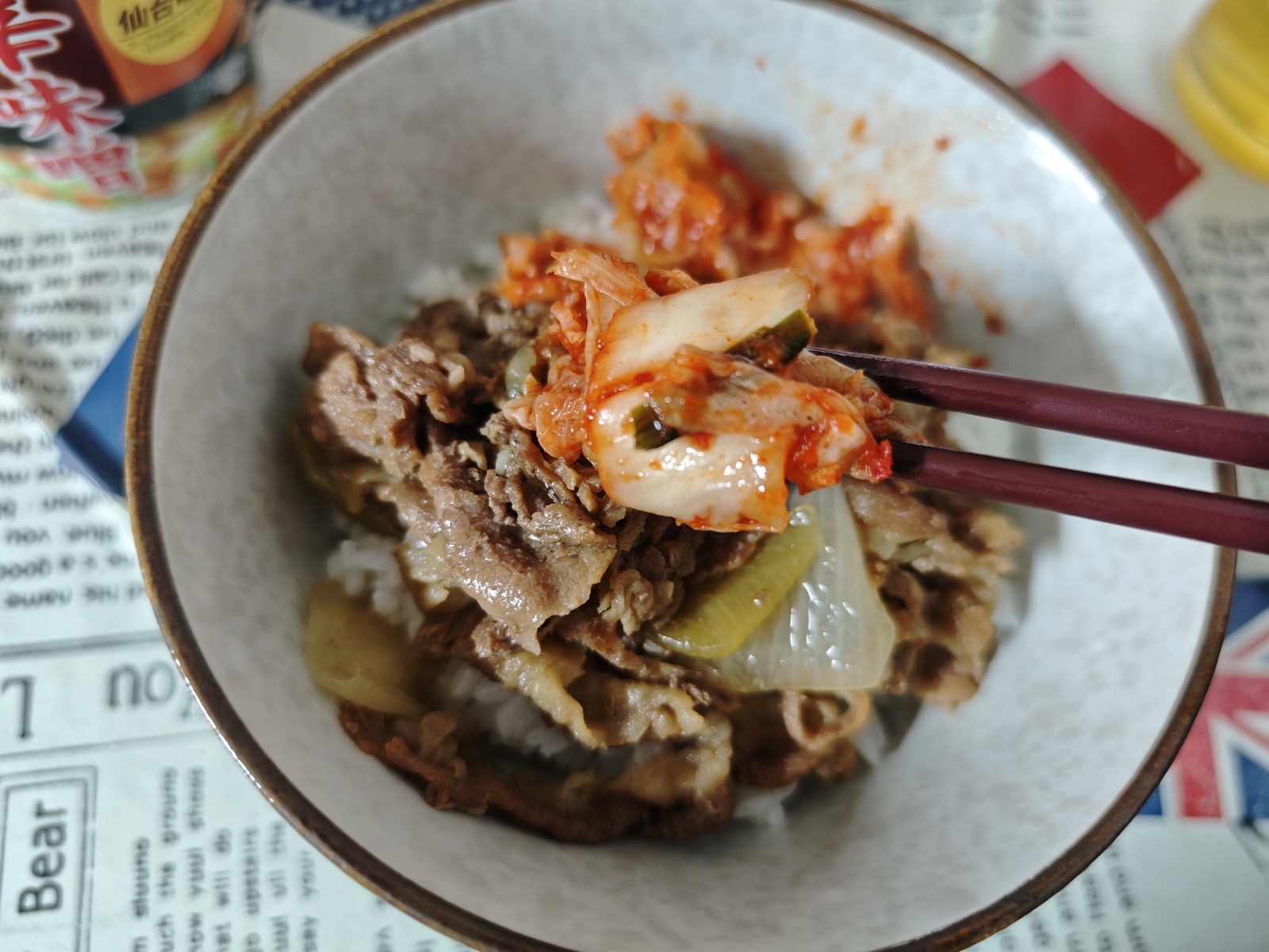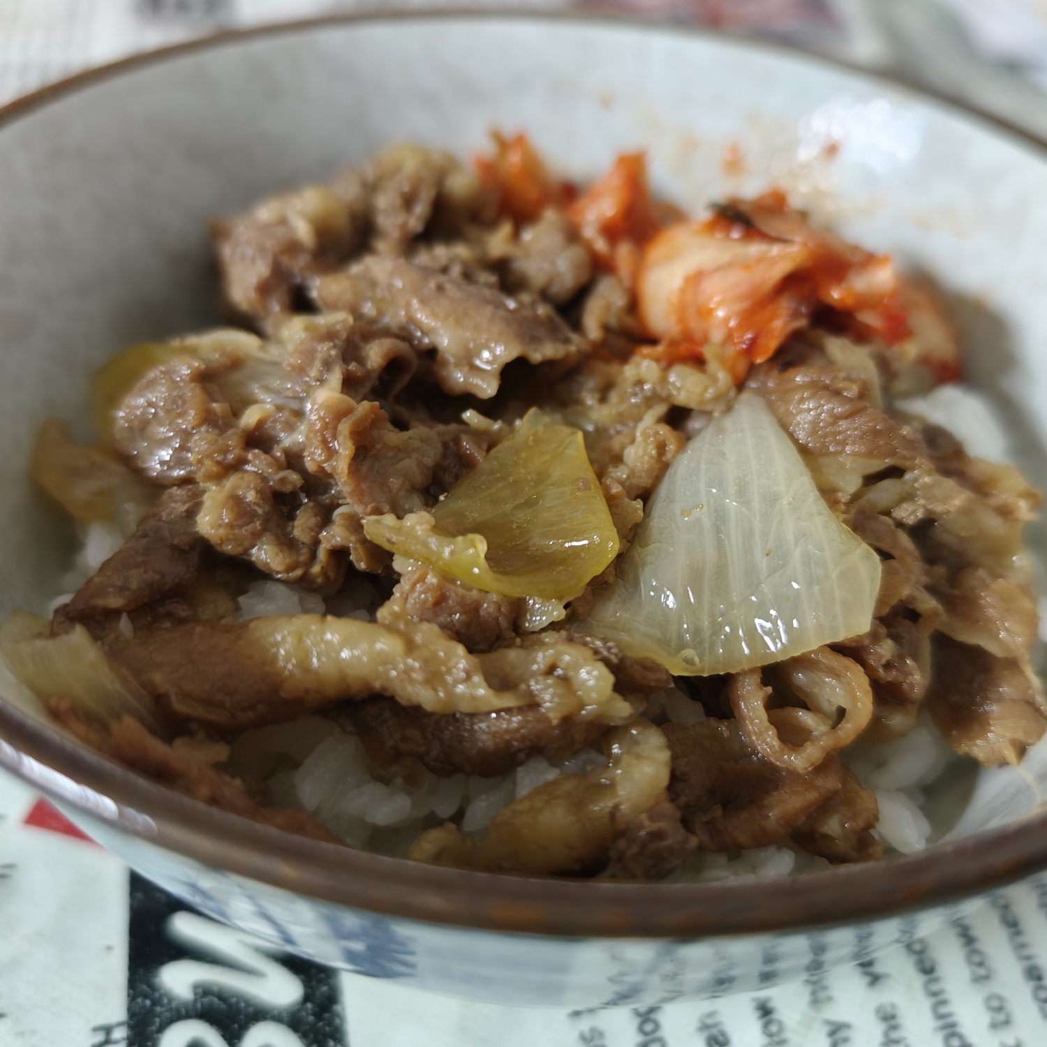 休日のお手軽昼食。自家製「牛丼」に、市販の「キムチ」をのせるだけです。お供には「仙台辛味噌ラーメン」で、おいしく頂きました。